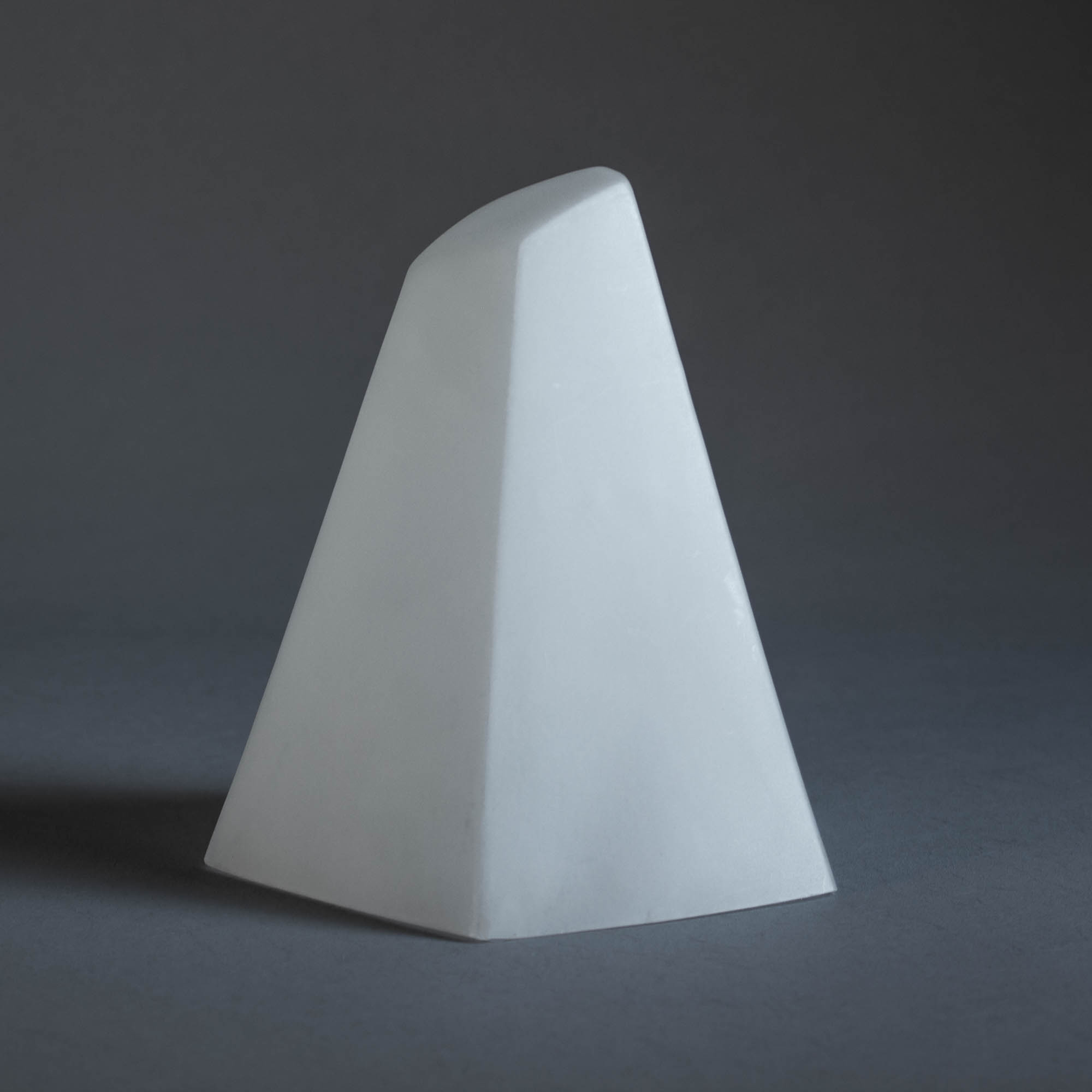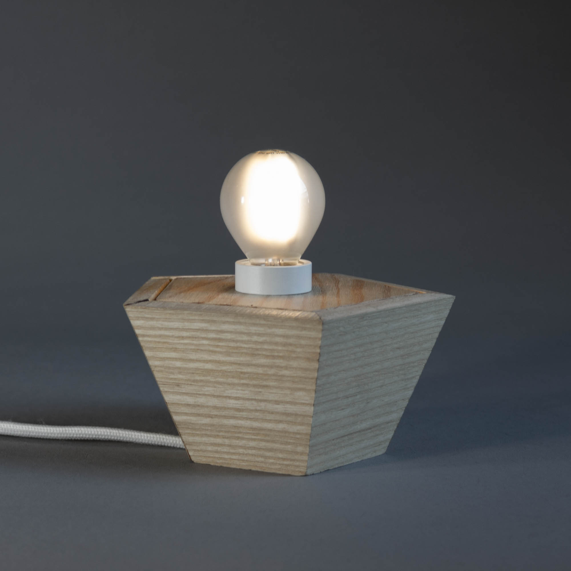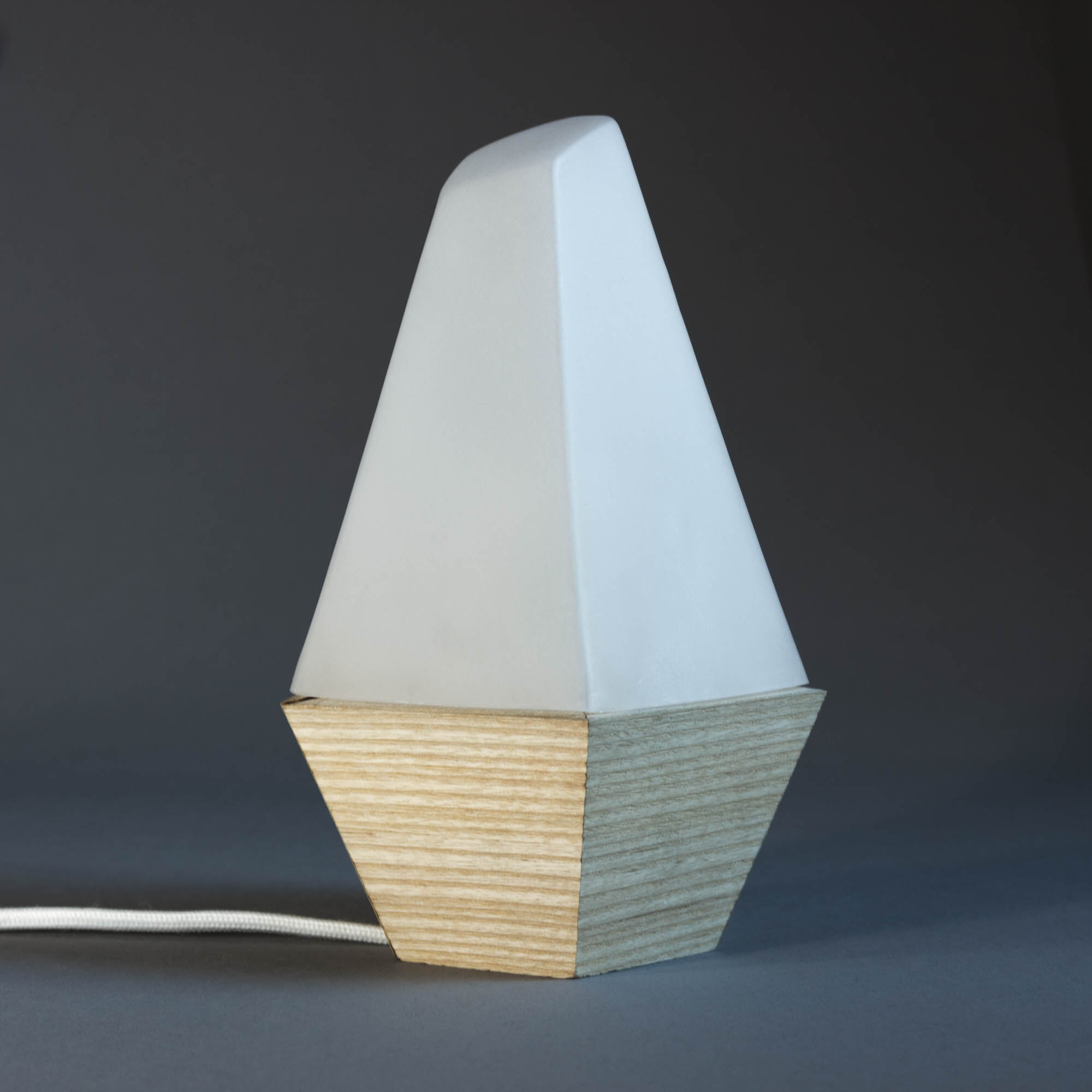 Design av femkantet nattbordslampe. Skjermen er laget av vakuumtrekt, sandblåst plast, mens foten er laget av voksbehandlet ask.